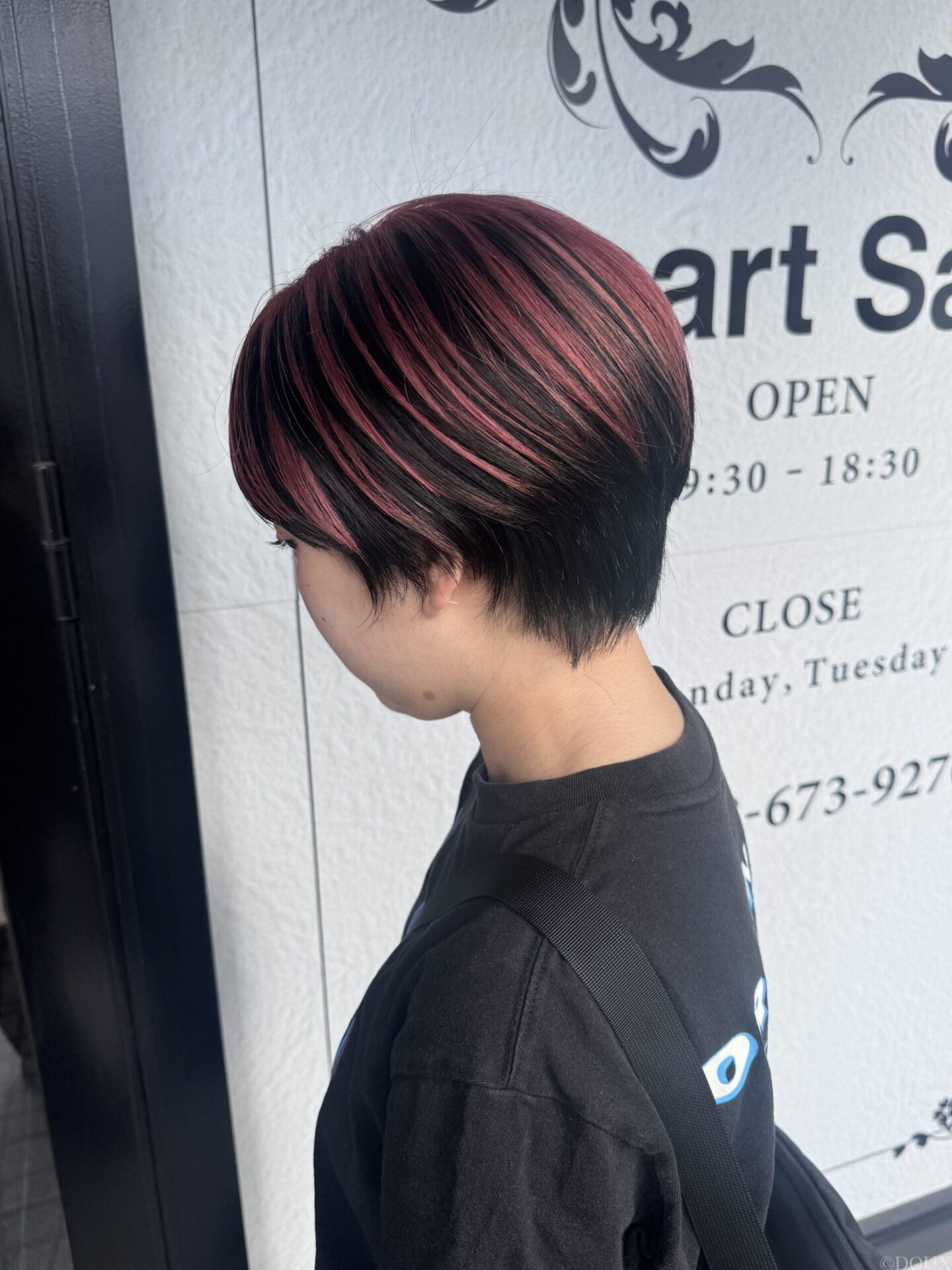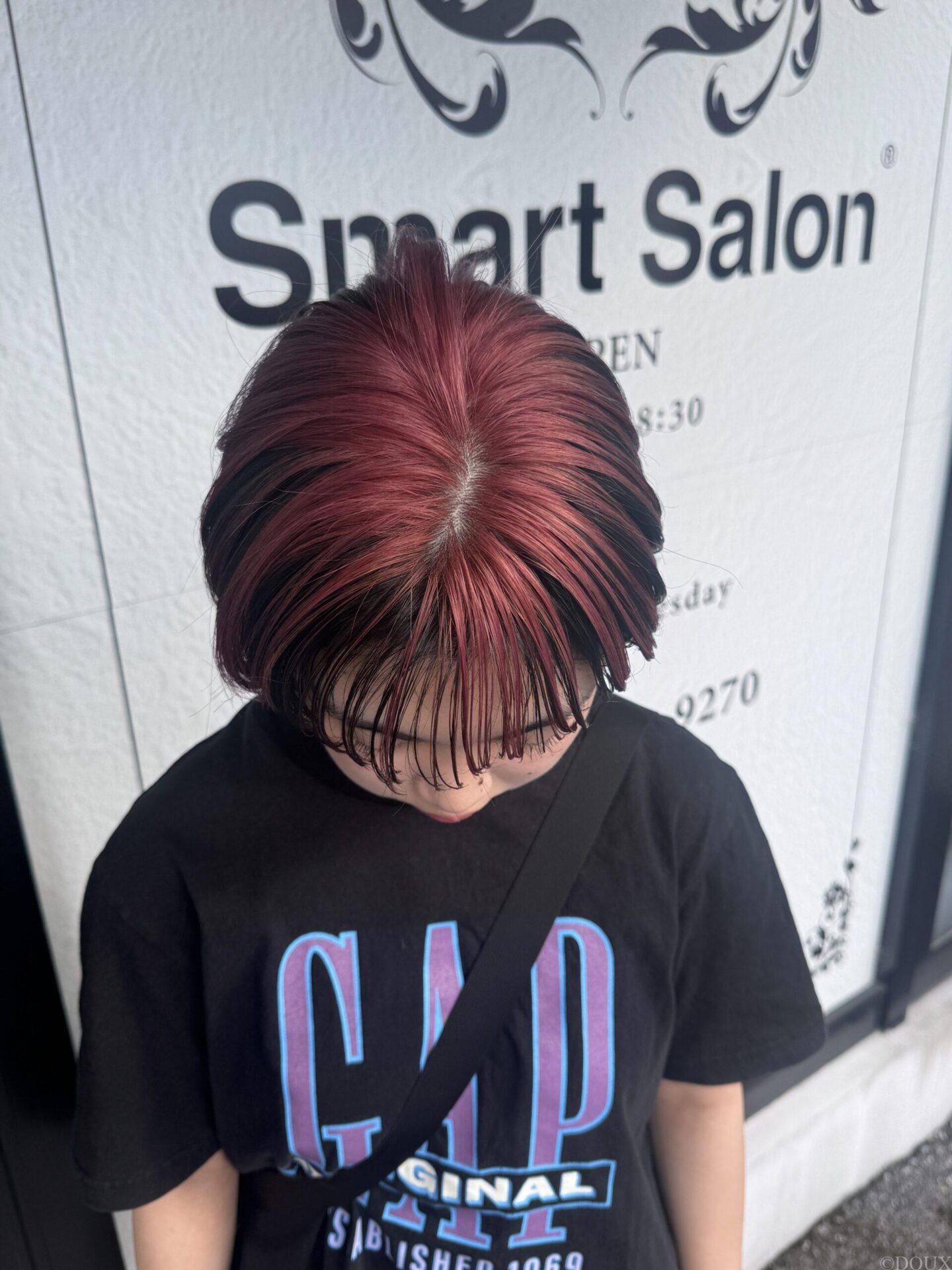 最大のメリットは、髪への負担を最小限に抑えられること。ブリーチが必要な場合でも、表面のわずかなエリアだけで済むため、全体のダメージが気になる方でも安心です。また、内側の暗い髪が引き締め効果(小顔効果)を生み出し、立体感のあるスタイルに見せてくれます。