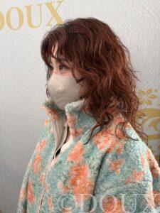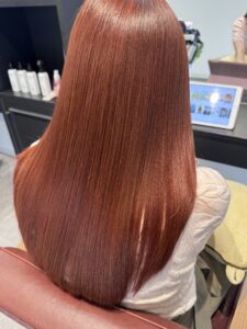 今回の完成スタイルです。ブリーチなしとは思えないほどの透明感と、オレンジベージュ特有のヘルシーなツヤが生まれました。ボルドー系の深みも感じさせる落ち着いたトーンは、お洋服を選ばない上品な華やかさがあります。