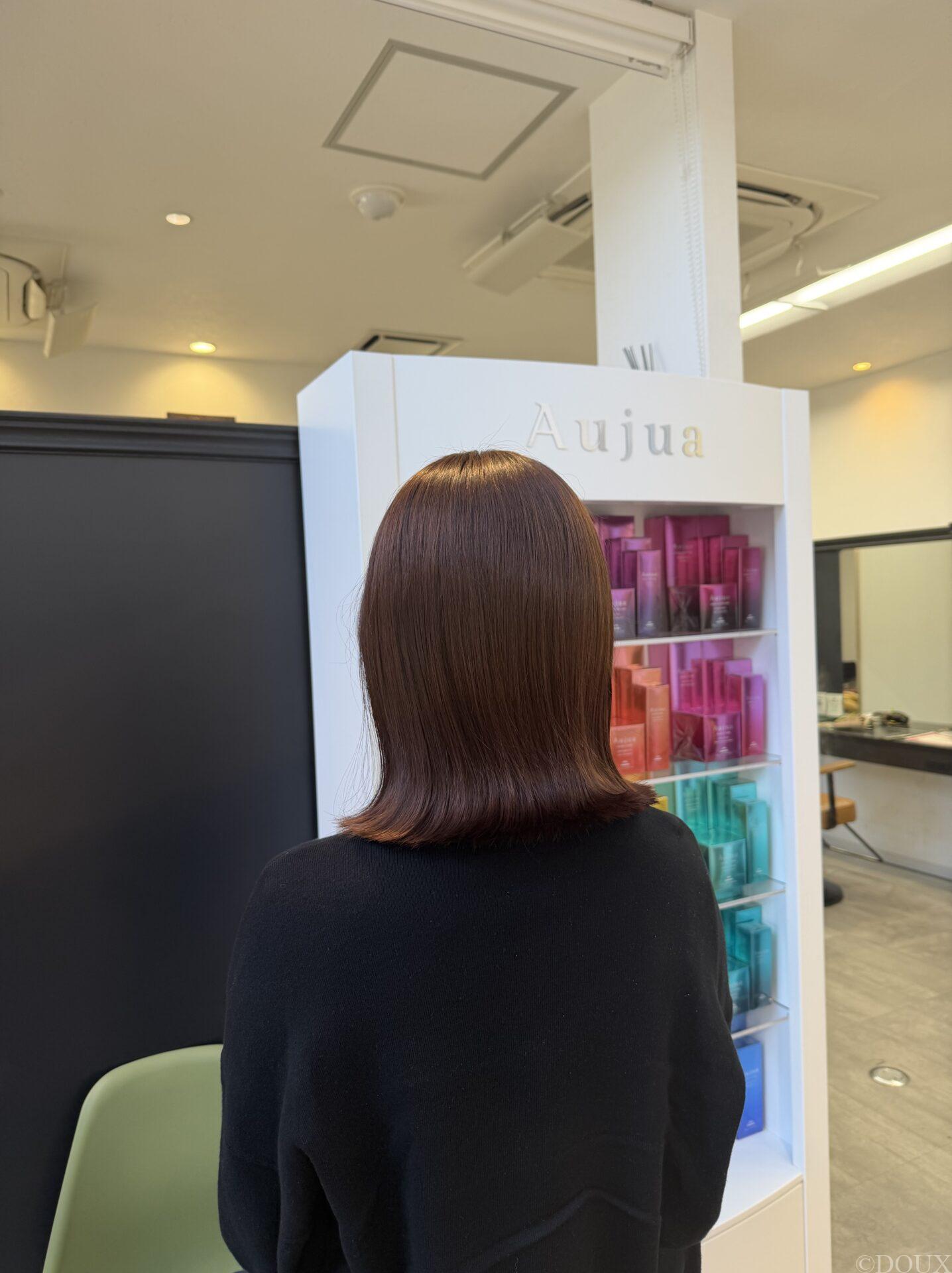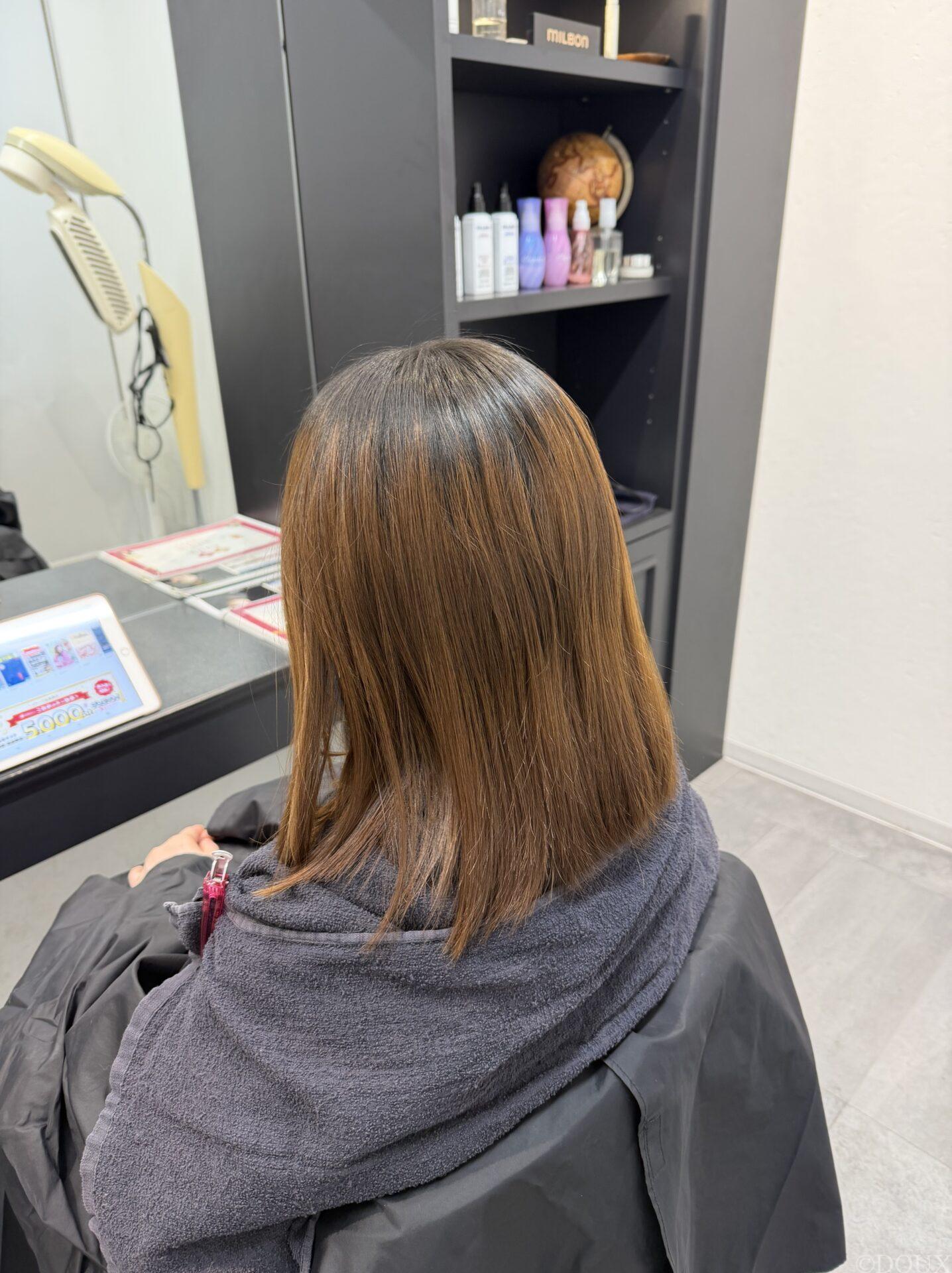 根元から毛先まで色味が自然につながり、ツヤ感もぐっとアップしています。