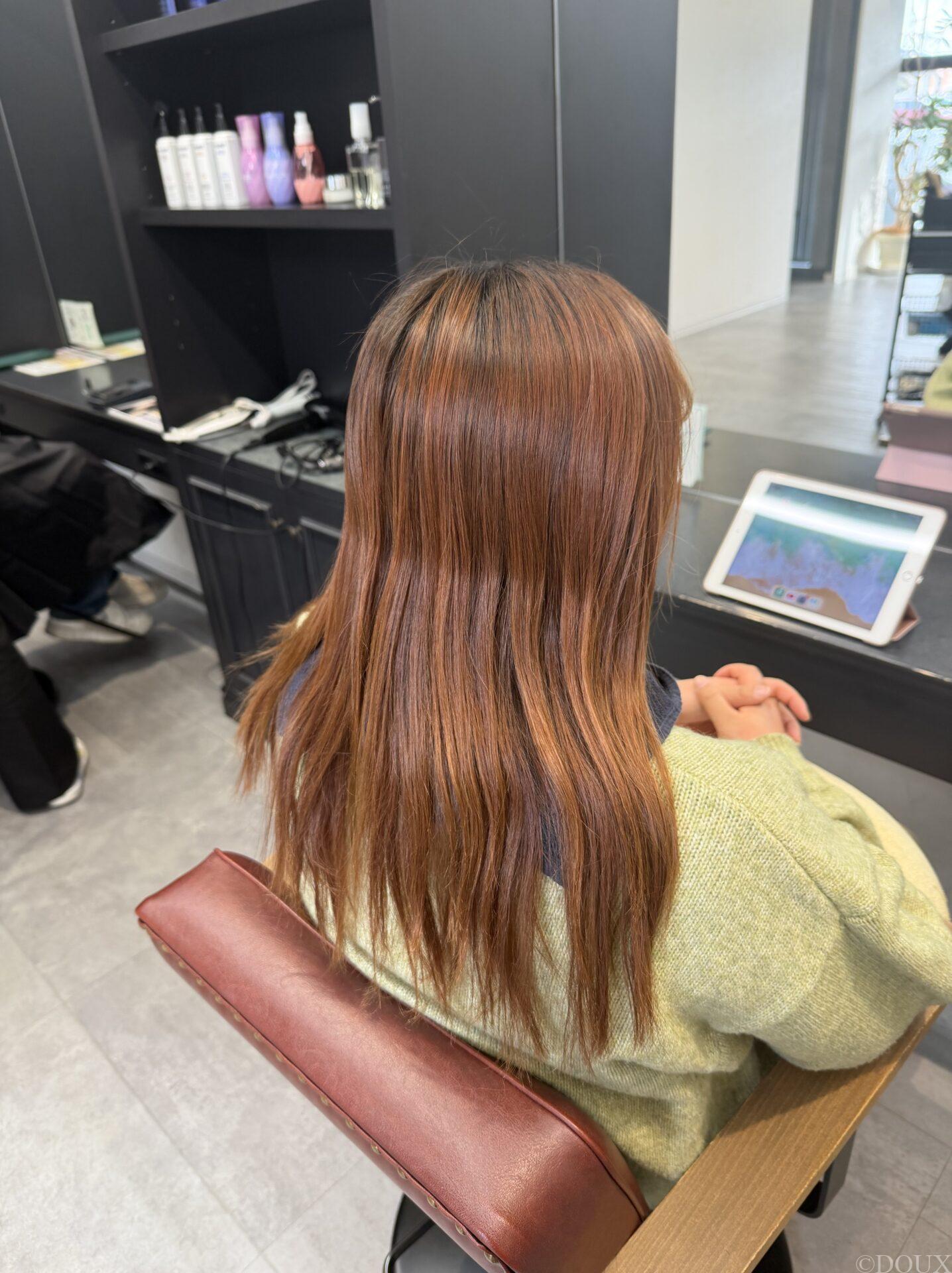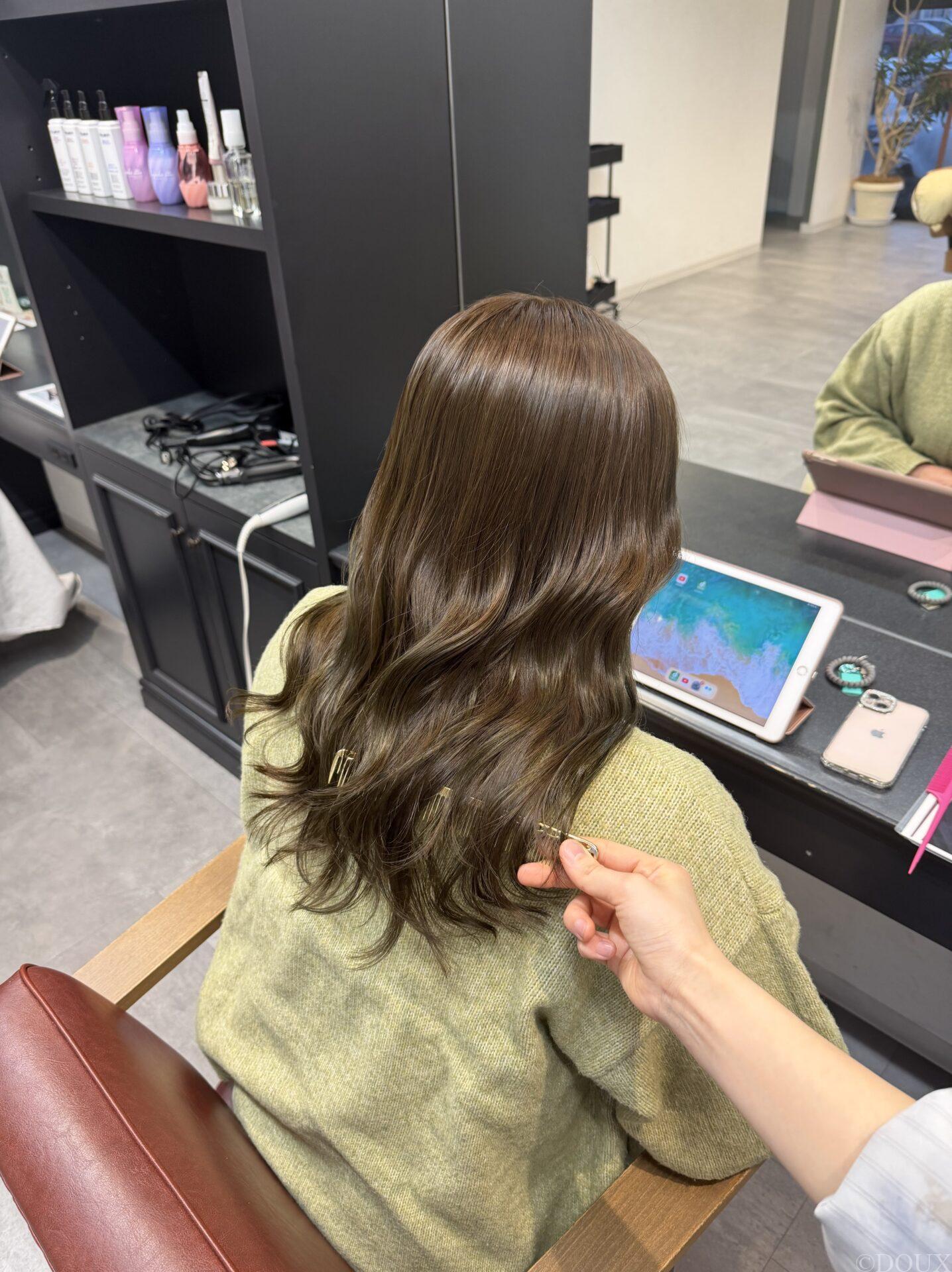 髪の負担をなるべく抑えながらカラー剤を調整しています。