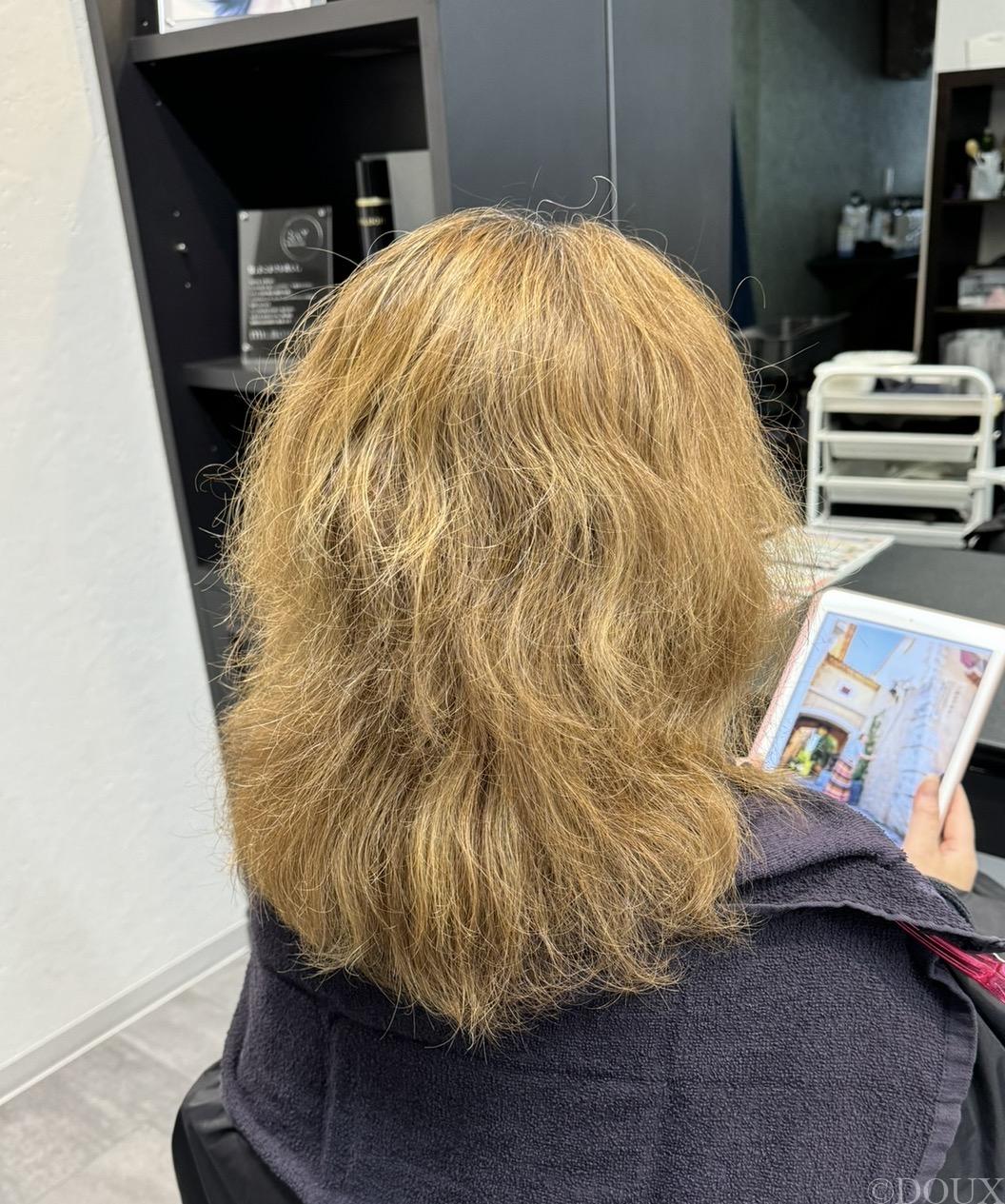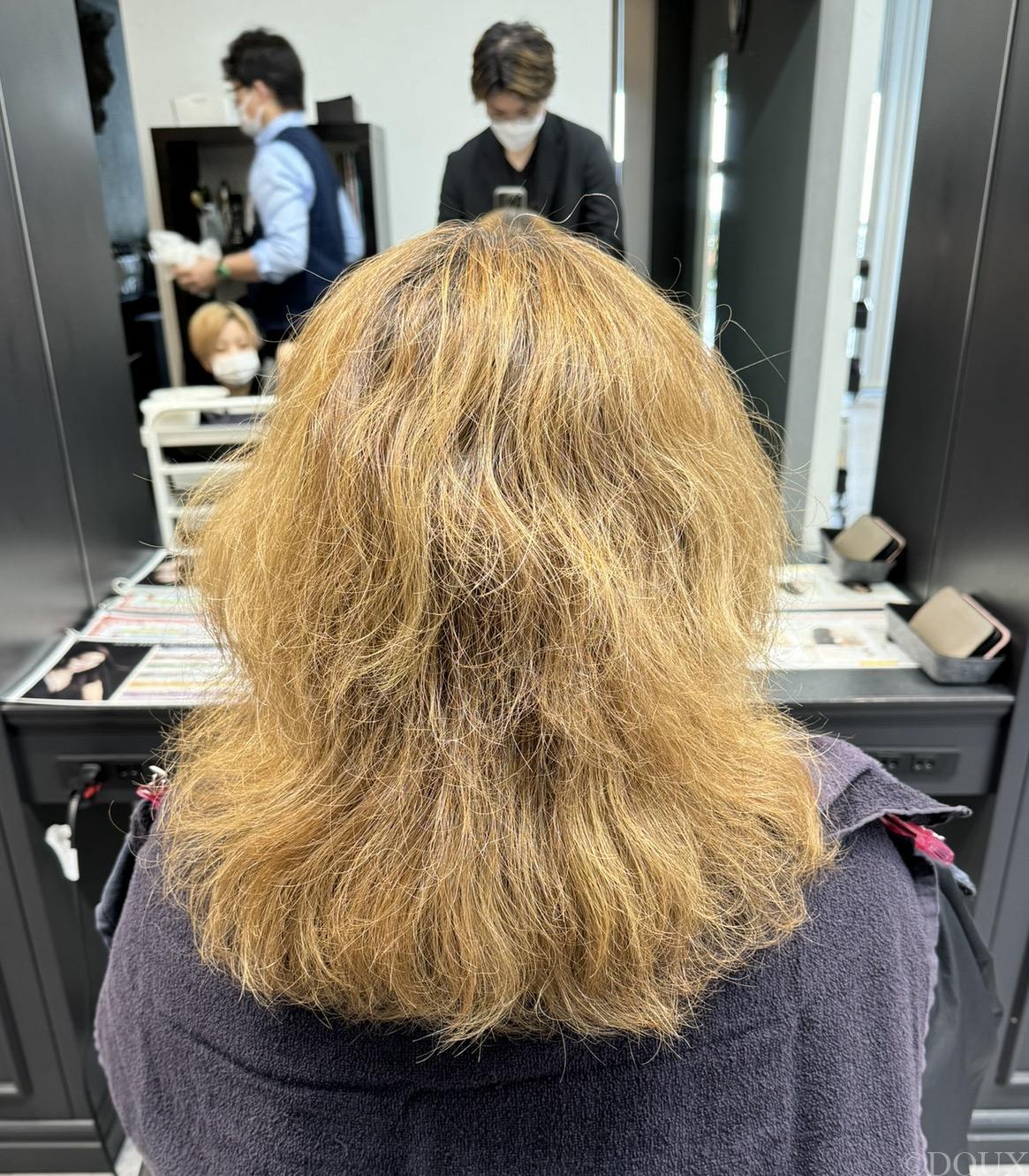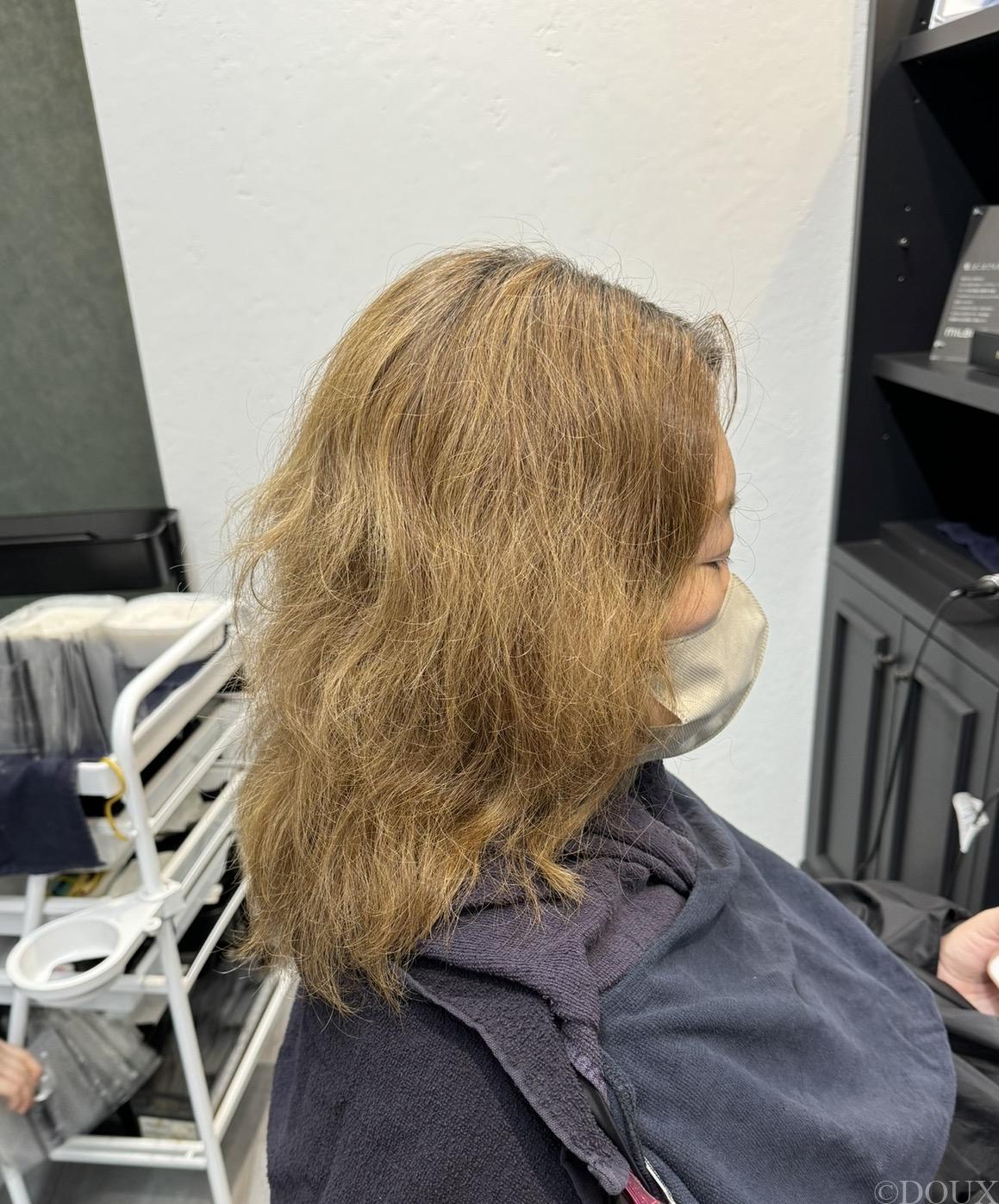 今回は、白髪染めハイライトをされている髪専用の縮毛矯正として施術を行いました。