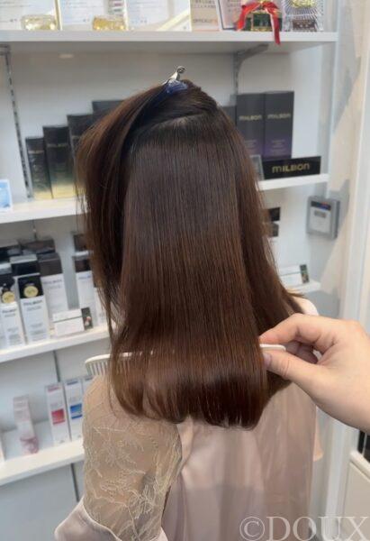 くびれ強めで小顔見えする前上がりミディアムレイヤー