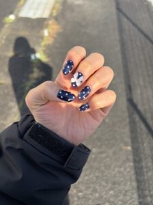 今回の私のネイルは、 ネイビーのドットに立体リボンで、シンプルだけど可愛いデザインです♡ ヘアカラーも、ネイルやファッションとのバランスを意識するとおしゃれ感がぐっと上がります☝️ 例えば今...