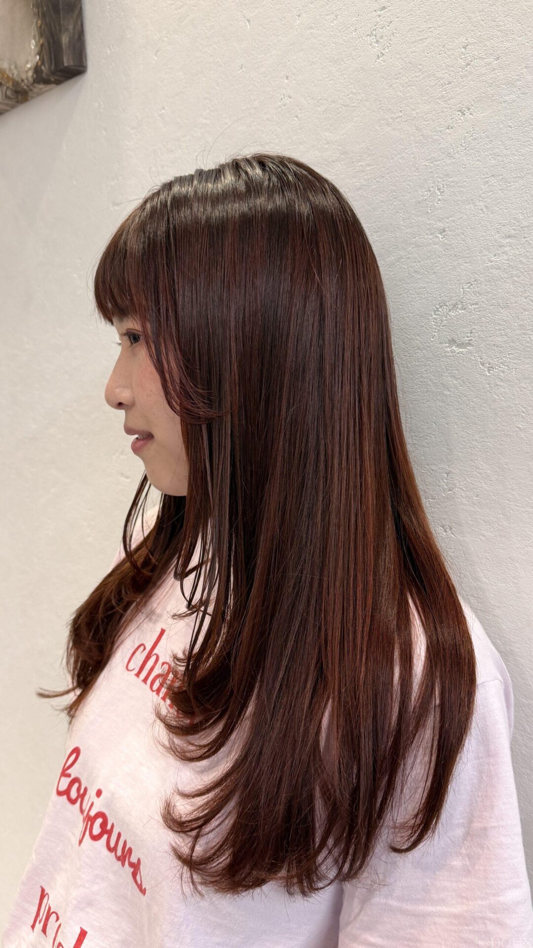 カットは、顔まわりにレイヤーを入れて小顔効果とロングでも動きの出るスタイルに。