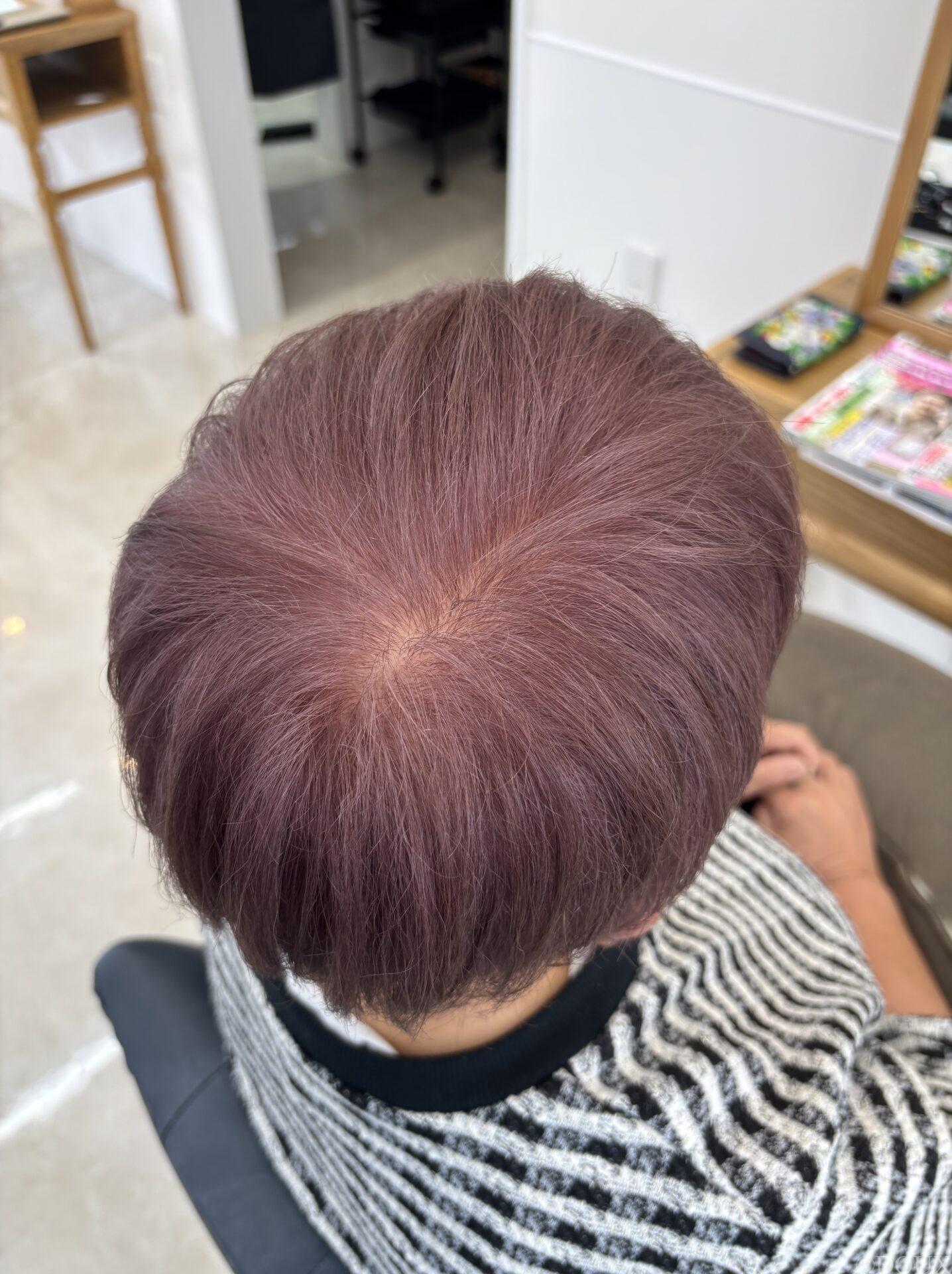 白髪率がほぼ100%のお客様。 白髪を活かしてピンクみのあるラベンダーベージュを入れることで、色落ちした時に白っぽく色落ちします! 髪の状態とお好みのお色を組み合わせて、伸びた時に根元と毛先の境目を根立にくくする配合にしました♪