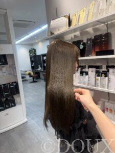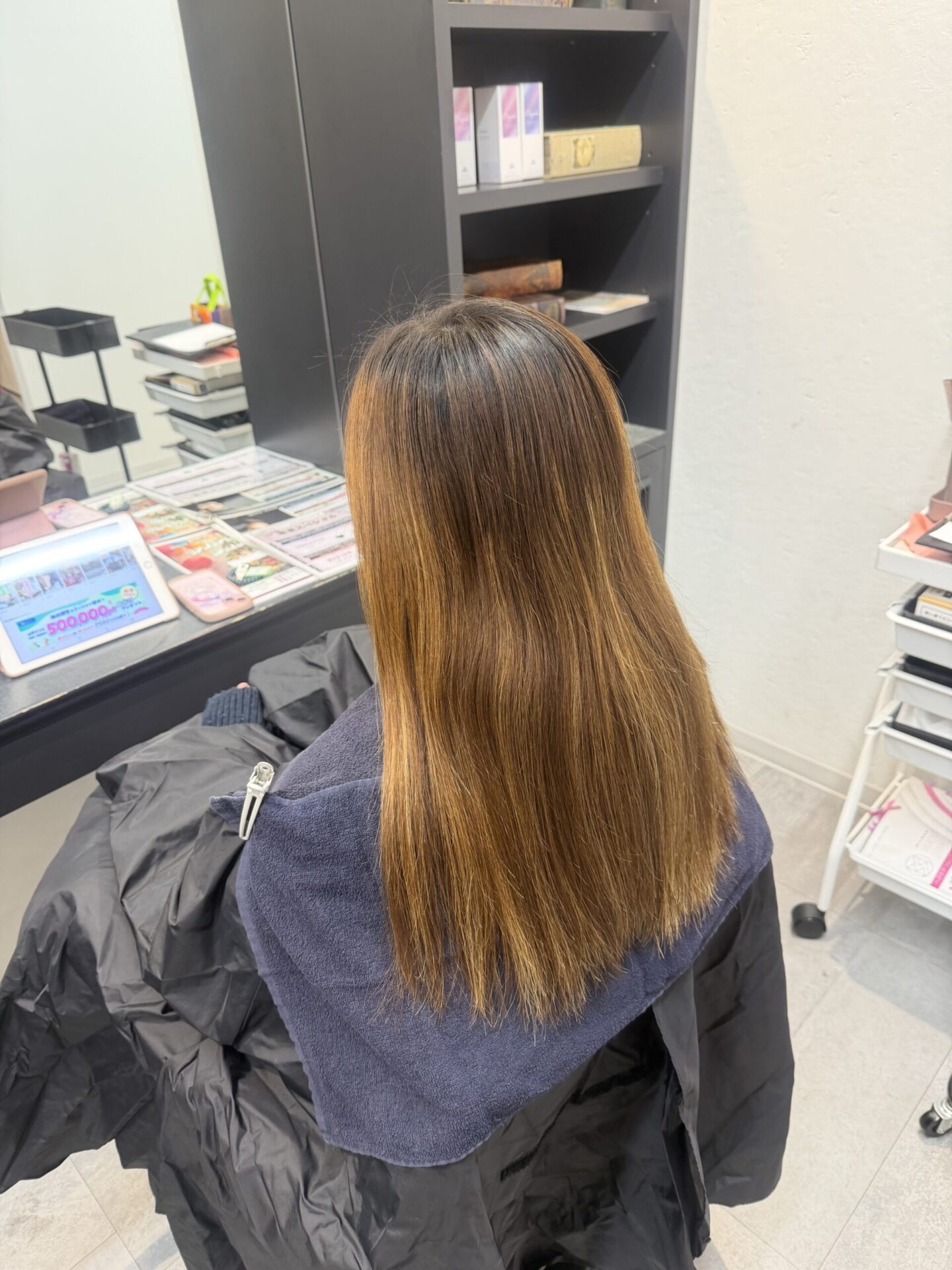 ハイライトが入っている髪を、 赤みをしっかり抑えた“やわらかグレージュ”にトーンダウンしました🕊️ もともとのハイライトが透け感を残してくれるので、 暗くしすぎず大人っぽい抜け感に◎ ムラになりやすいハイライト部分も、 染料の濃度を調整して均一に。 ツヤと透明感がしっかり戻った仕上がりです✨
