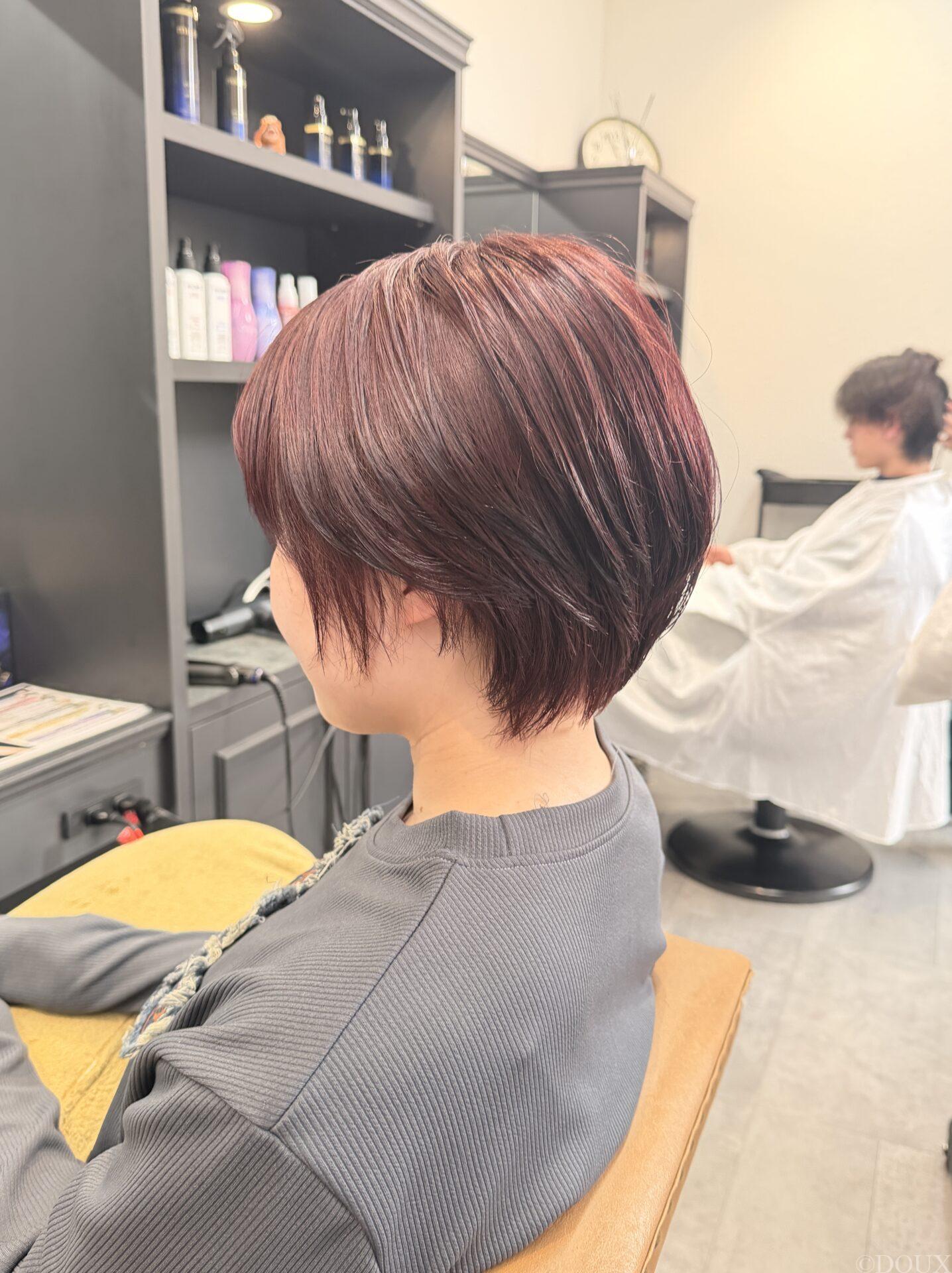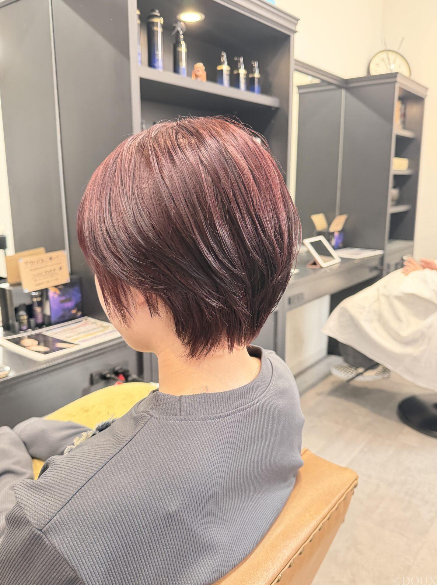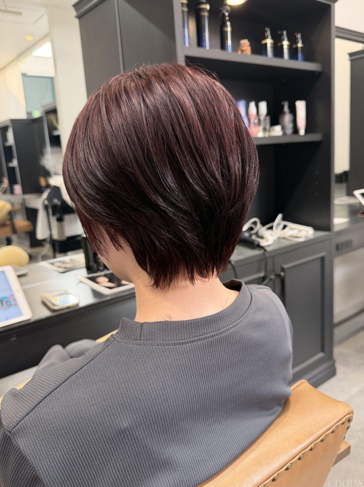 カットは耳が少し見えるくらいのハンサムショートボブ。