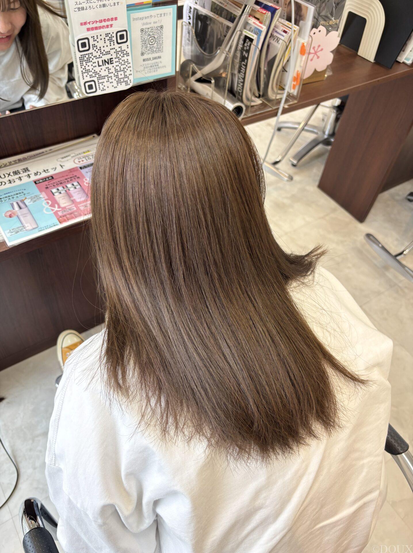 ブリーチなしでなるべく透明感を出したいとのことで、明るいカラーを繰り返し土台を作り、赤みを消し透け感が出るオリーブベージュにお染めしました。
