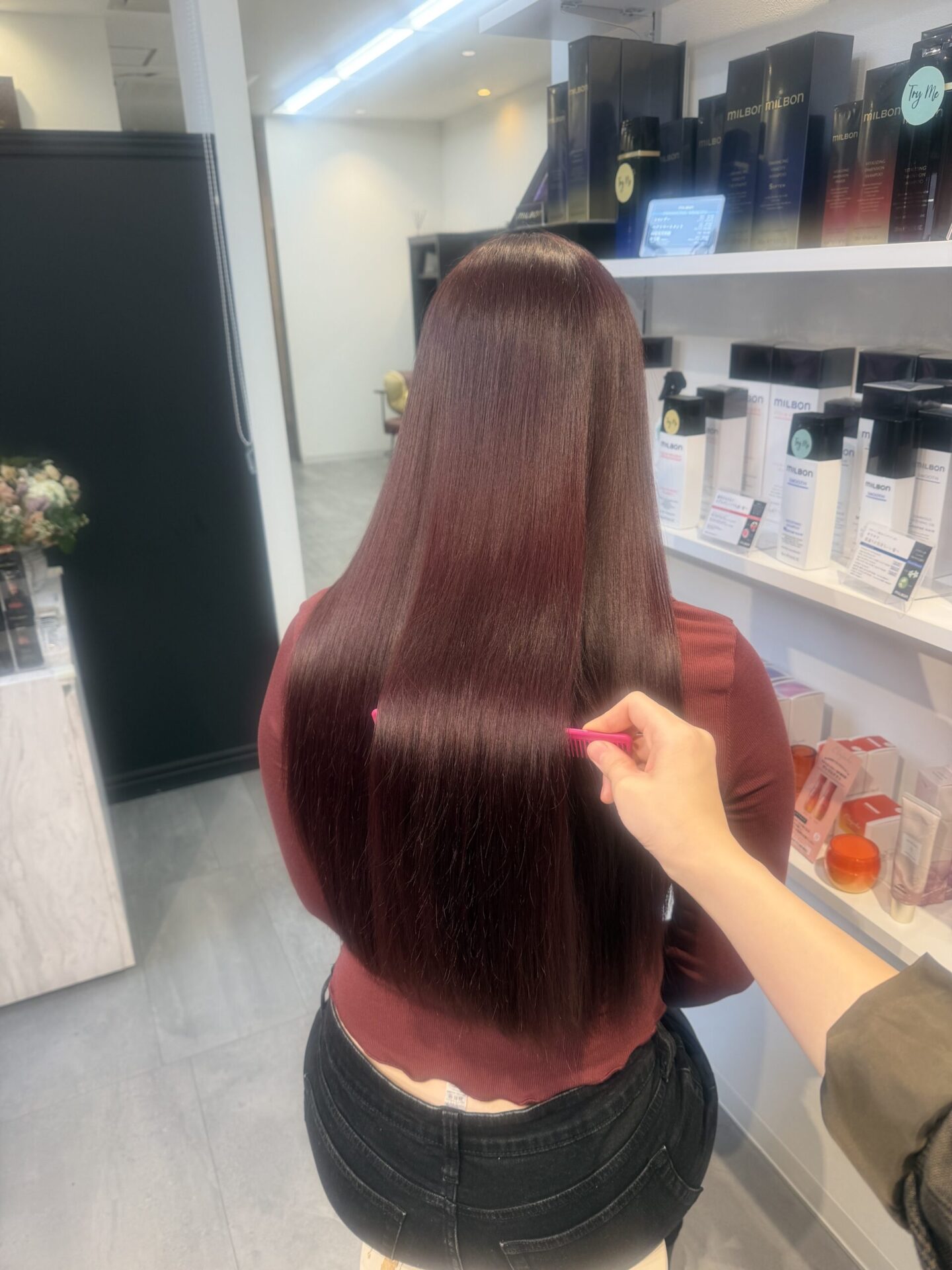 深みのあるボルドーカラーで、ツヤと柔らかさを両立🕊️ ブリーチなしでもしっかり発色し、髪の内側から光が透けるような仕上がりに。 赤すぎない落ち着いたボルドーだから、大人っぽく上品な印象にまとまります。 光の当たり方でほんのり色味が変わる、秋にぴったりの艶カラーです🌿