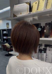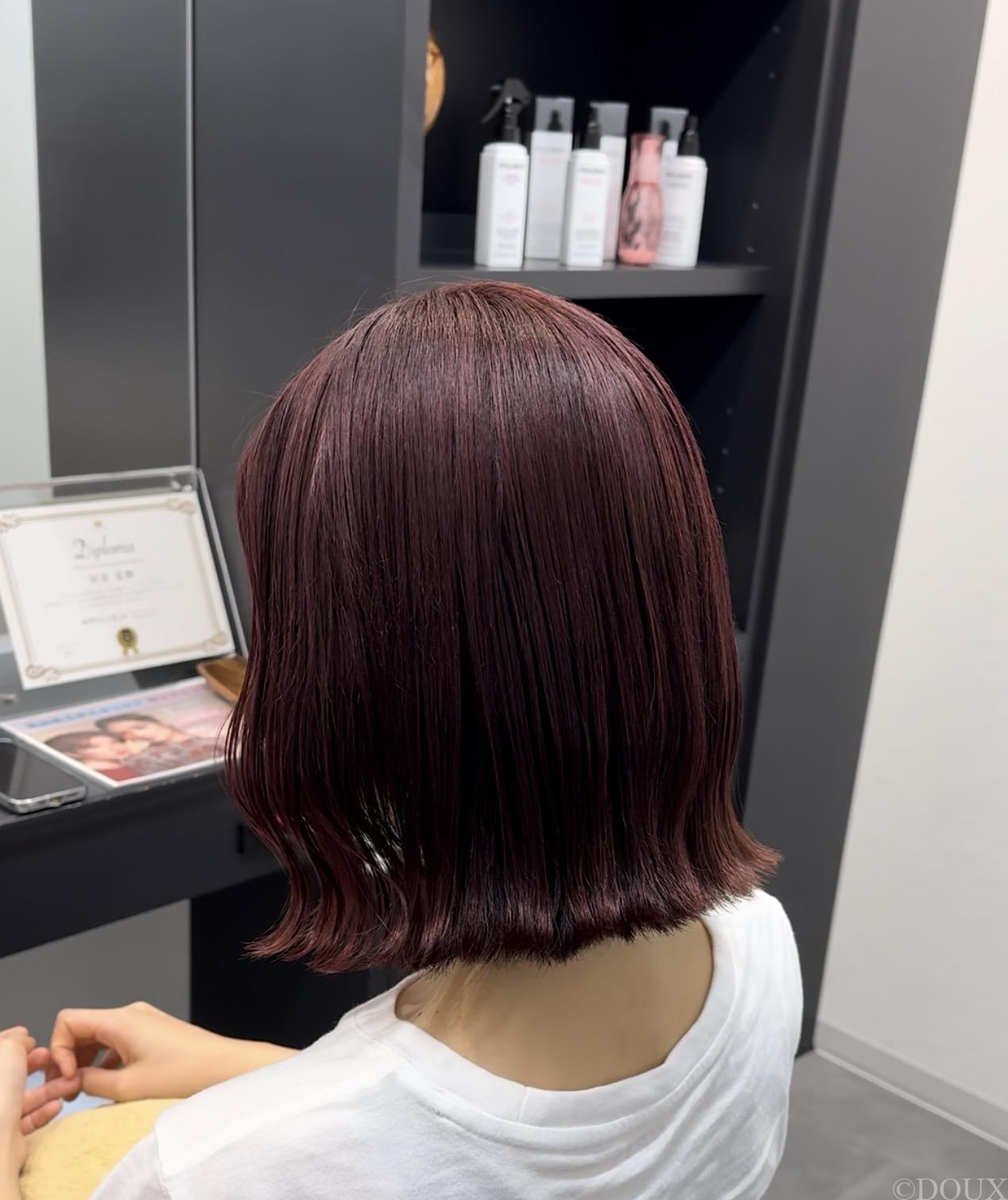 ボルドーカラー×外はねボブは、大人っぽさと程よい抜け感を出したい方におすすめ。 深みのあるボルドーが血色を良く見せ、顔色を明るく見せてくれます。 外はねにすることで重たく見えず、直毛や広がりやすい髪質とも相性◎がよいです!