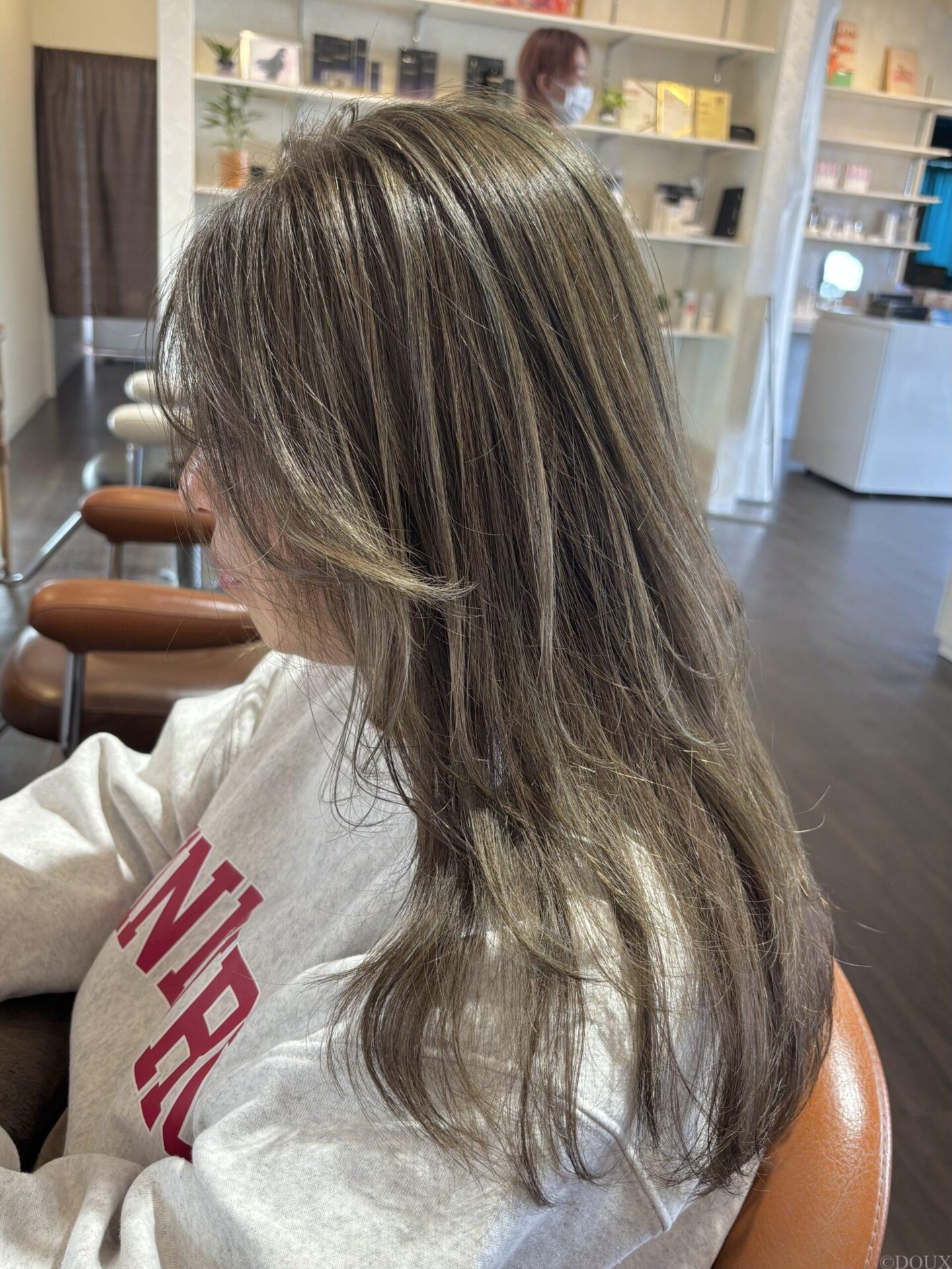 トップと顔まわりのみハイライトを1ヶ月前に入れていましたが、ハイライトをつぶさず透明感感じるオリーブグレージュにさせていただきました✨ 入れ方一つで、少ない量のハイライトで白髪はボケますのでダメージ最小限で髪に優しく♪